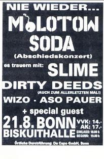 statt, bei dem neben Molotow Soda die Bands Slime, Hass, Wizo und Dirty Deeds aufspielen. Der Auftritt der